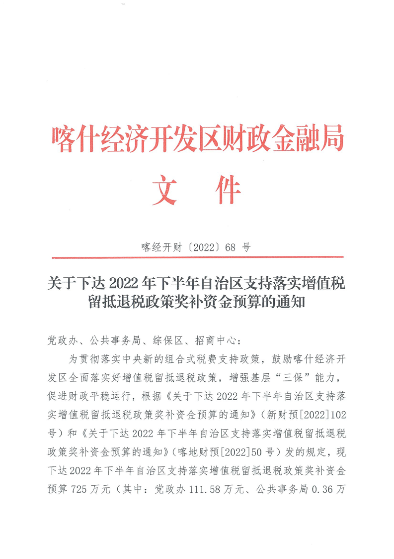 關于下達2022年下半年自治區支持落實增值稅留抵退稅政策獎補資金預算的通知